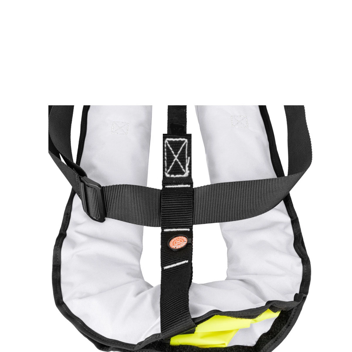 Diese Rettungsweste ist mit einfachem Schrittgurt und Signalpfeife ausgerüstet, Sprayhood und SOLAS-Light gehören allerdings nicht zum Lieferumfang.