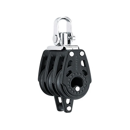 Der kräftige, leichtlaufende 29 mm Carbo Dreifachblock mit Wirbel und Hundsfott überzeugt durch geringes Gewicht, hohe Belastbarkeit und Zuverlässigkeit. Wangen und Scheibe sind aus hochfestem, leichtem Carbo Komposite gefertigt. Frei laufende Delrin Kugellager sorgen für leichten Lauf, auch unter hoher Belastung. Runde Lagerschalen leiten die Kräfte gleichmäßig ab und erhöhen die Belastbarkeit.