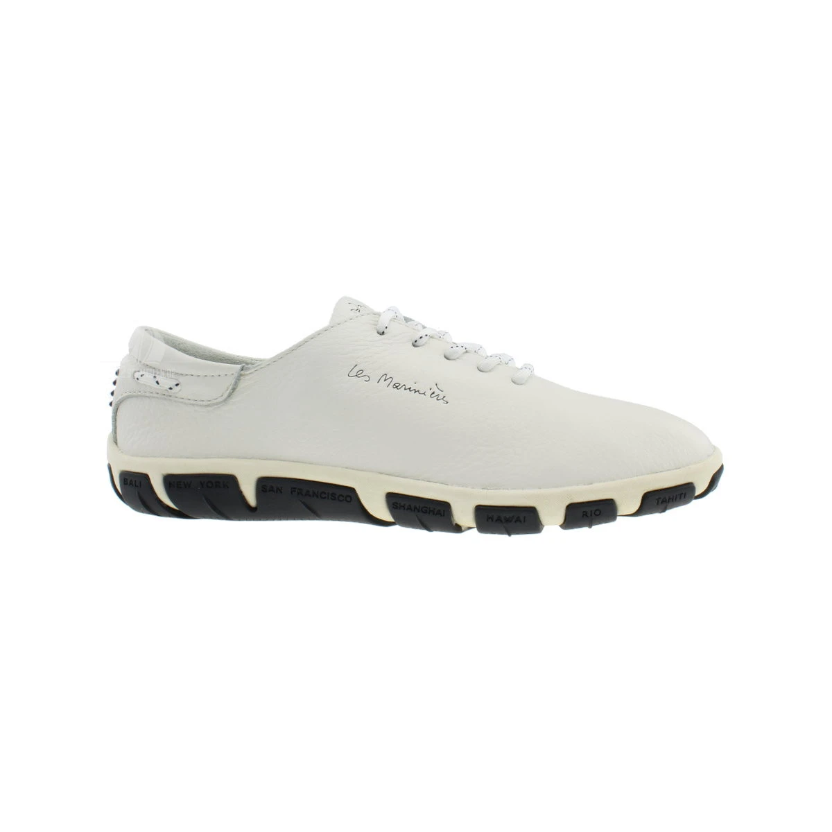 Der TBS Jazaru aus der Serie Les Marinièrs ist ein modischer und komfortabler Bootsschuh für Damen. Er ist ungefüttert, besteht aus Kalbsnarbenleder und hat im vorderen Bereich keine Nähte. Dadurch ist er sehr angenehm zu tragen und schmiegt sich dem Fuß der Trägerin an. Das atmungsaktive Material erlaubt es, dass der TBS Jazaru Bootsschuh auch ohne Socken oder Strümpfe bequem getragen werden kann. Durch das seewasserfeste und schnell trocknende Material ist der Bootsschuh der ideale Begleiter an Deck. Die flexible Gummisohle hat ein rutschfestes Profil und bietet dadurch den nötigen Halt auch bei nassen oder welligen Verhältnissen. Die Innensohle des TBS Jazaru ist herausnehmbar. Für ein modisches Highlight sorgt das Sohlendesign mit prominenten Urlaubszielen. Der sportliche Bootsschuh lässt sich mit einem sauberen Baumwolltuch reinigen und sollte regelmäßig eine Pflegecreme für Leder auftragen bekommen.
