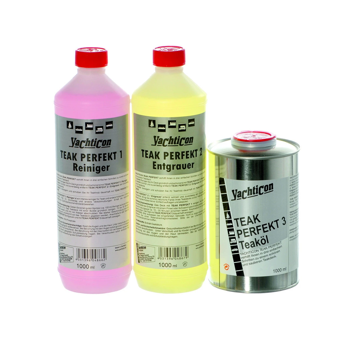 Das Set enthält je eine Dose TEAK PERFEKT 1-3. Mit YACHTICON TEAK PERFEKT verschönern Sie Ihr Deck in drei einfachen Schritten: 1. Schritt: Reinigen Sie Ihr Deck gründlich und schonend mit TEAK PERFEKT 1 / Reiniger. 2. Schritt: Schnell und zuverlässig entfernt TEAK PERFEKT 2 / Entgraut den Graubelag Ihres Teakdecks. 3. Schritt: Versiegeln und schützen Sie Ihr Teakholz dauerhaft mit TEAK PERFEKT 3 / Teaköl.